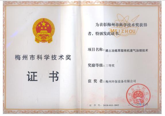 根据《梅州市科学技术奖励办法》的规定,梅州市科学技术奖项目经评审委员会专家评议、市科学技术奖评审委员会办公室审查,市人民政府决定授予我公司“稀土冶炼萃取有机废气治理技术”科学技术成果为梅州市科学技术奖三等奖。